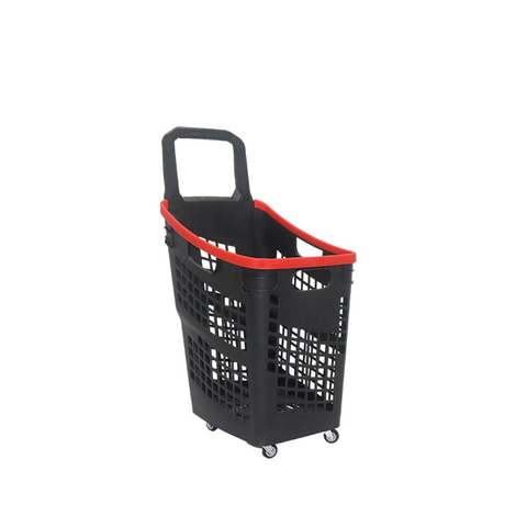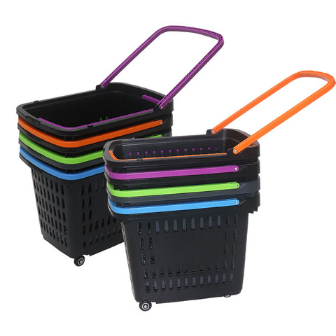 Cesta de compras de plástico de cuatro ruedas de lujo de capacidad media para uso comercial